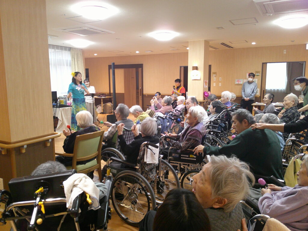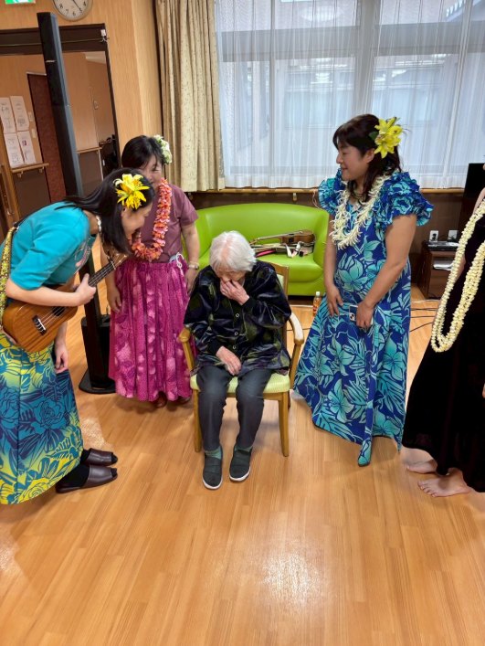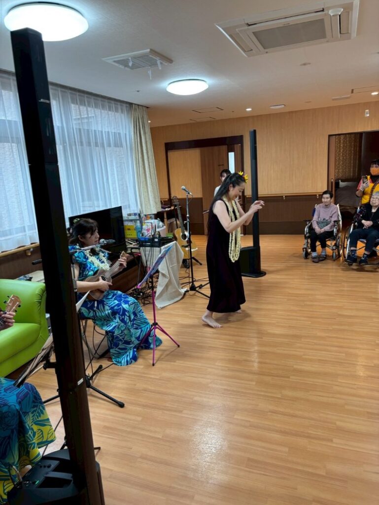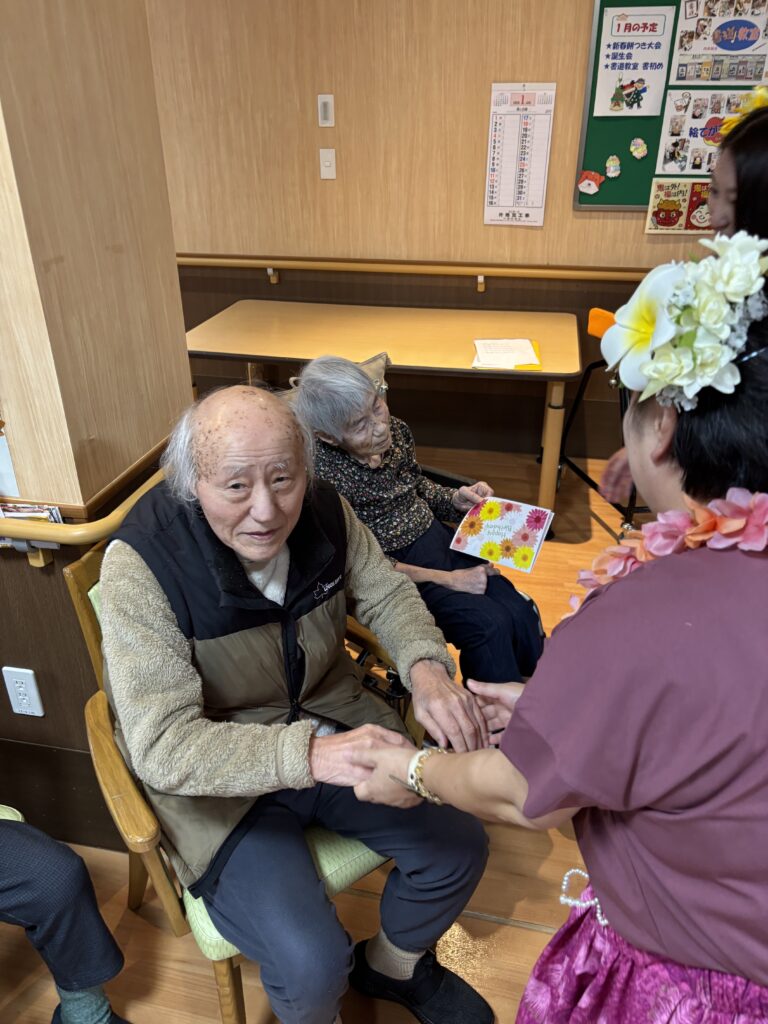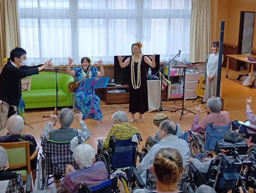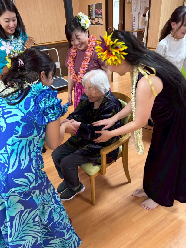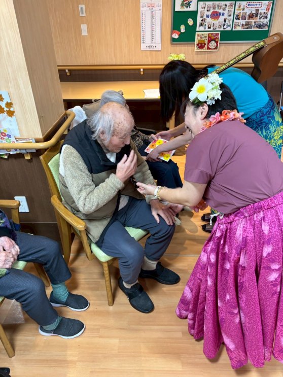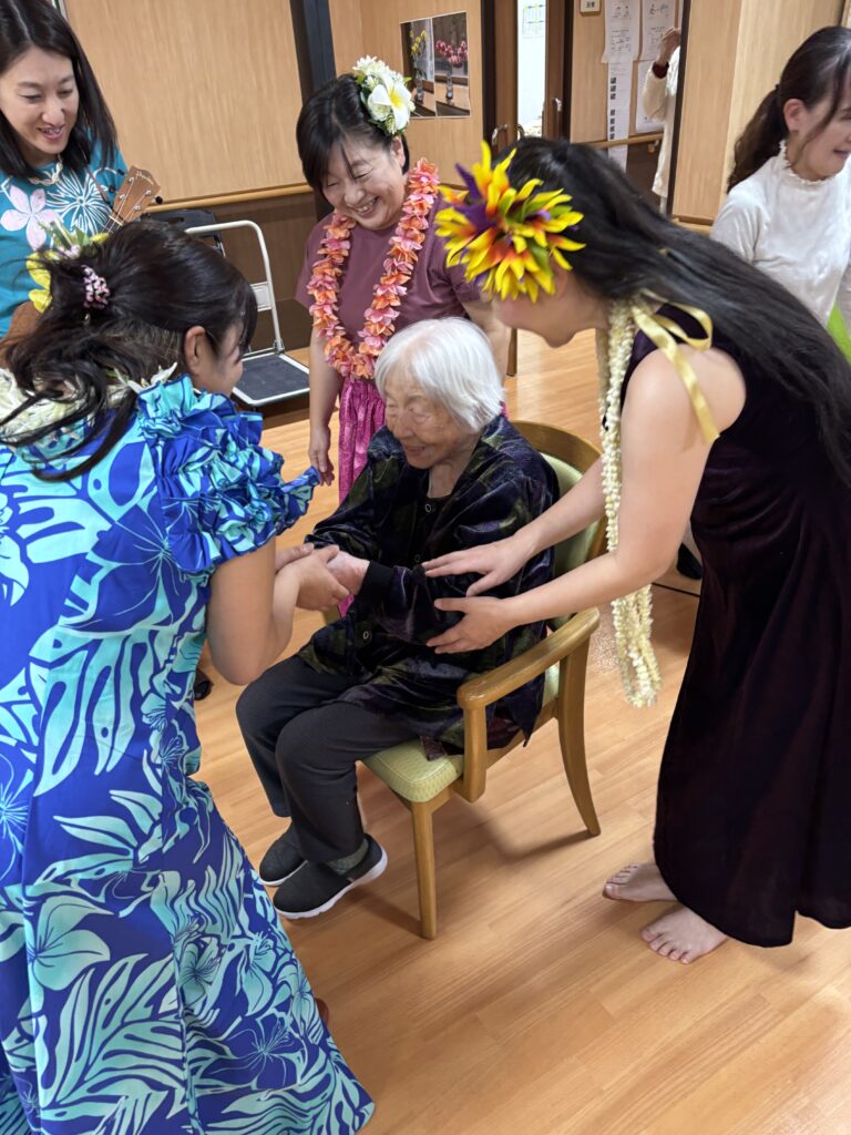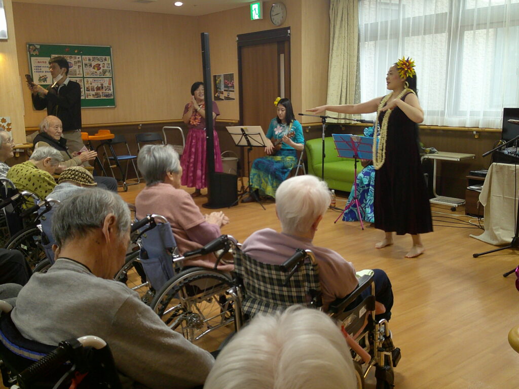 入所者様も、マラカスを振ったり、手を使ってフラの手話に一緒に参加。