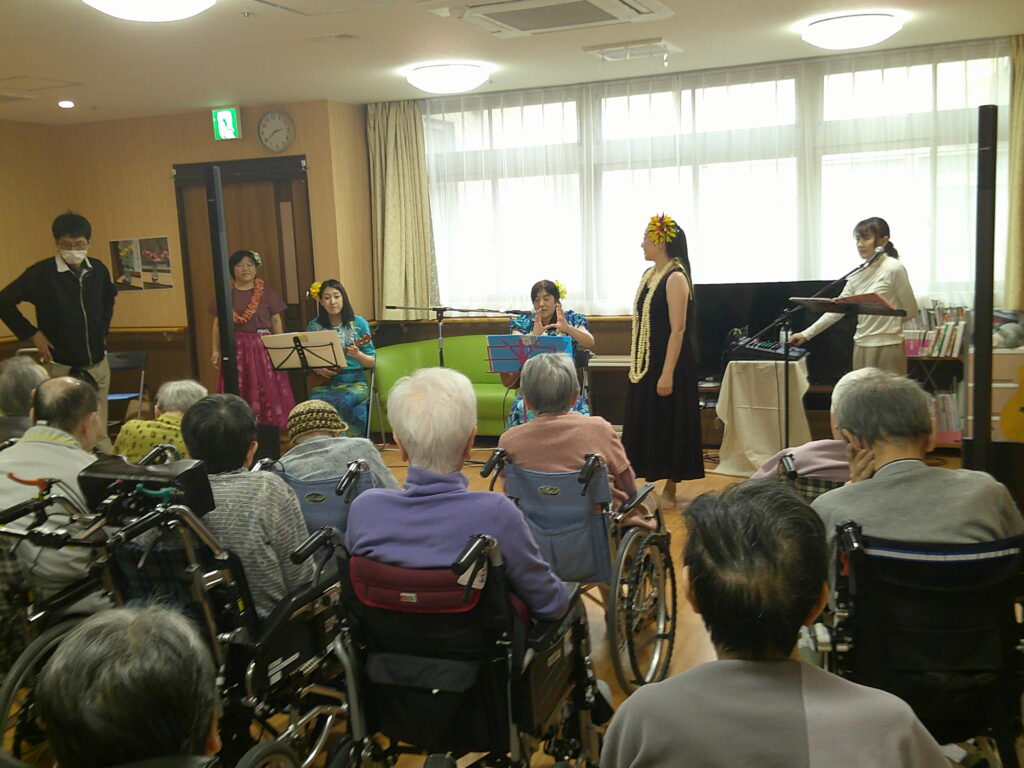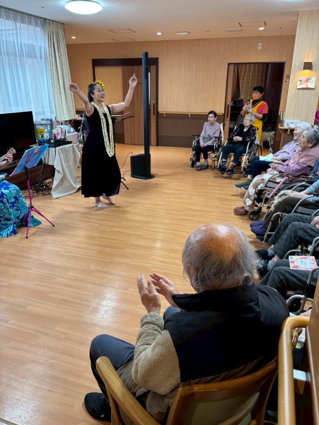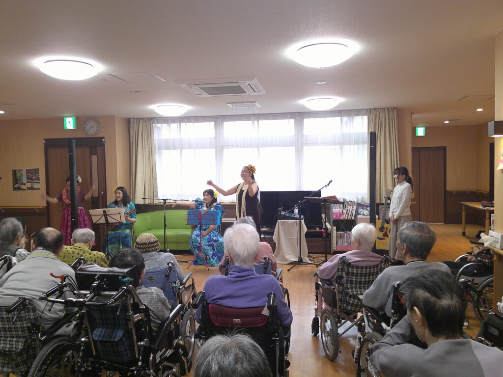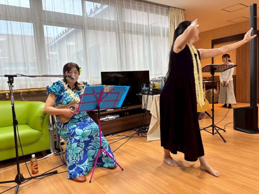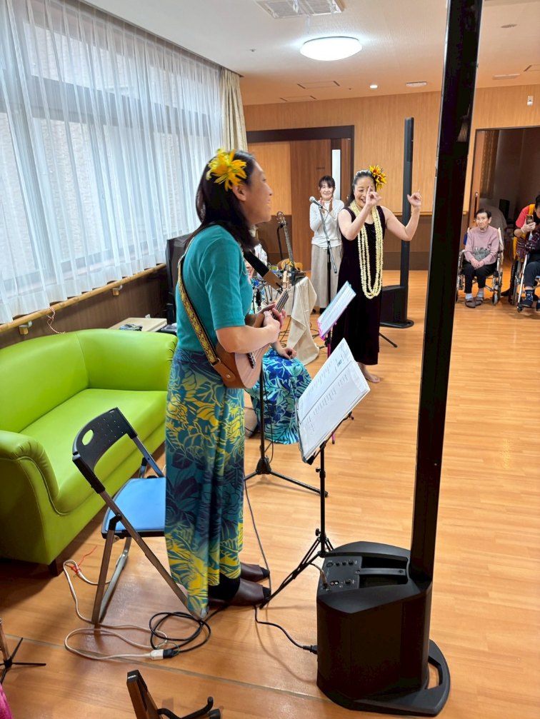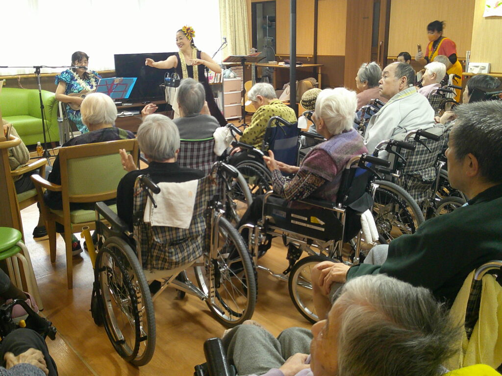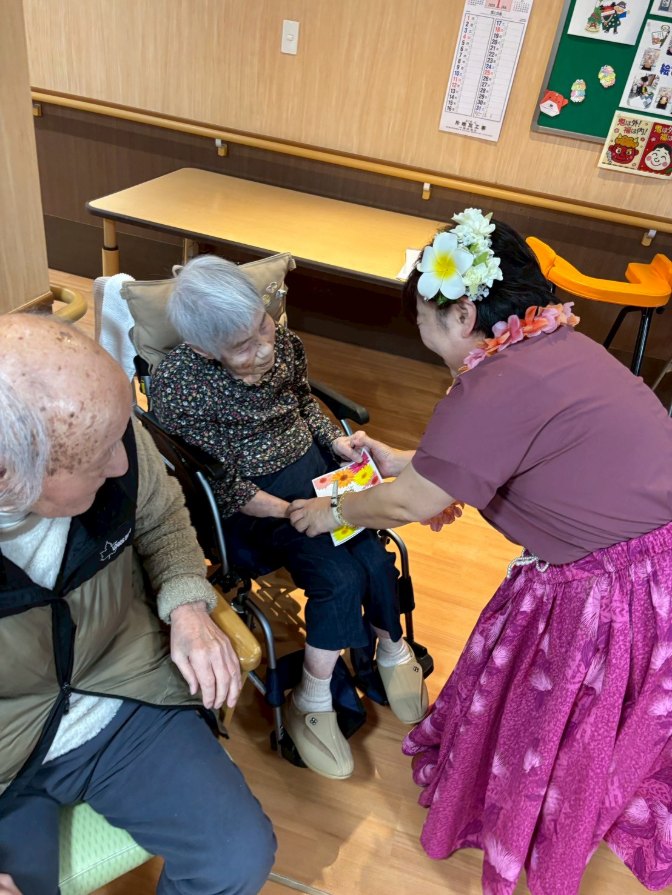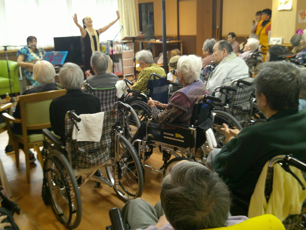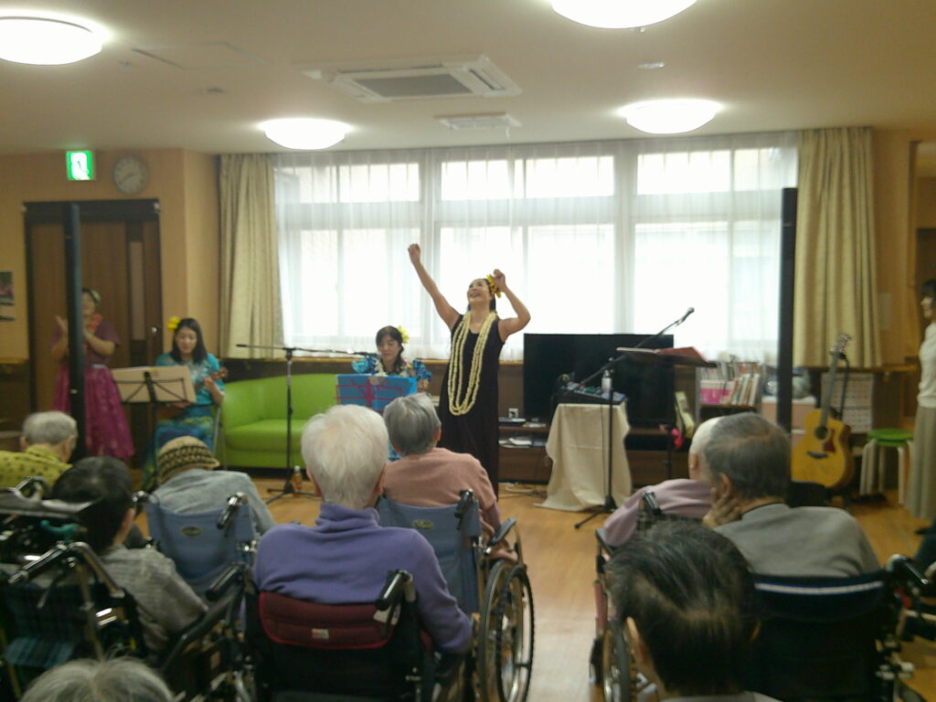 入所者様も、マラカスを振ったり、手を使ってフラの手話に一緒に参加。