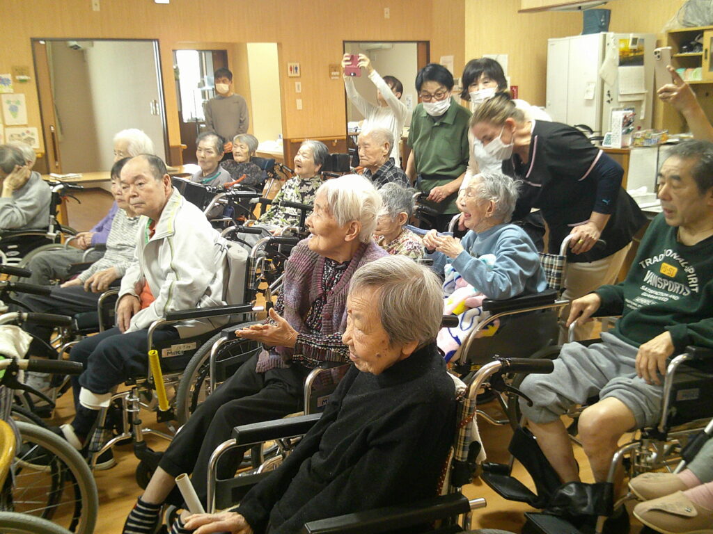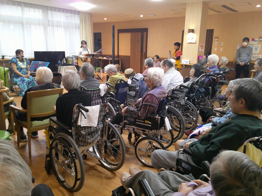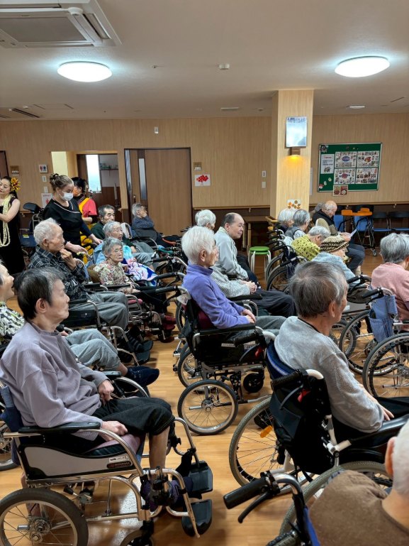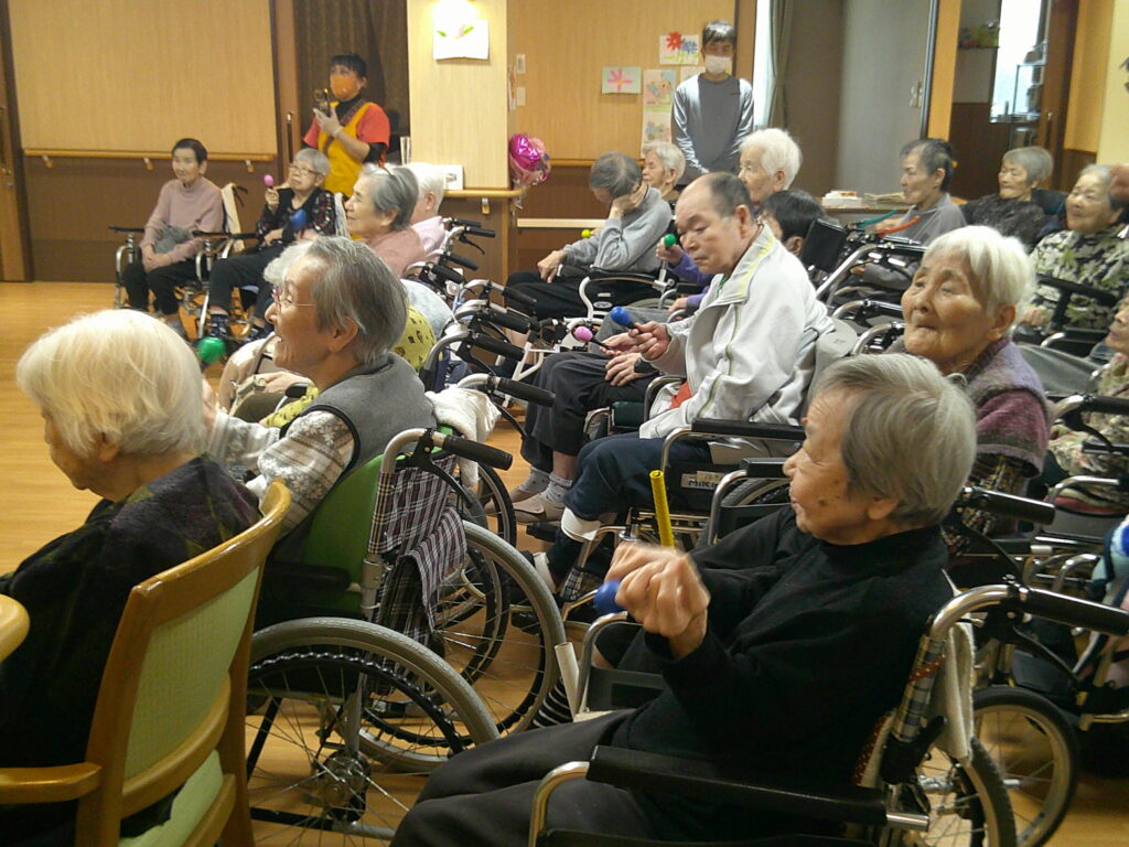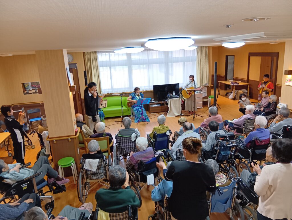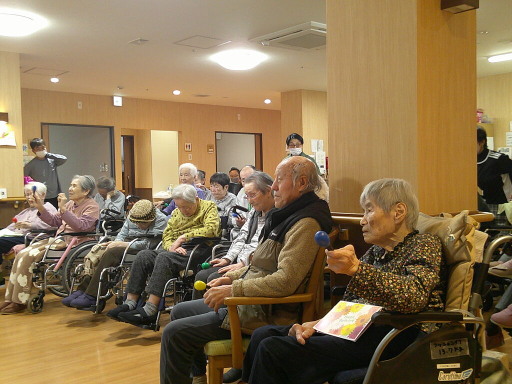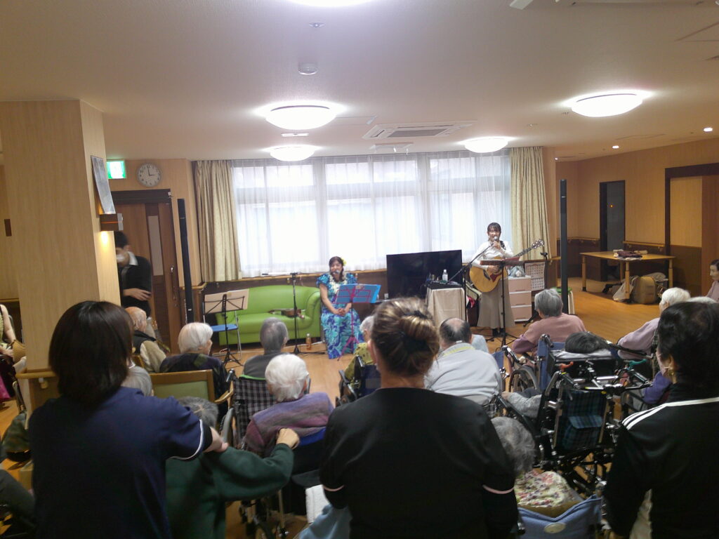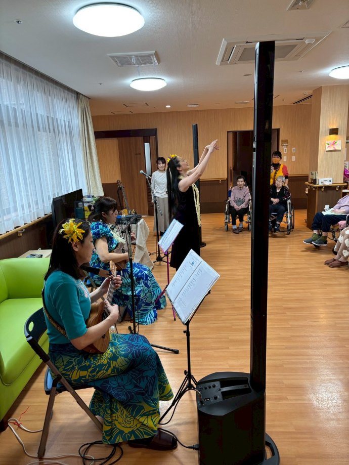 入所者様も、マラカスを振ったり、手を使ってフラの手話に一緒に参加。