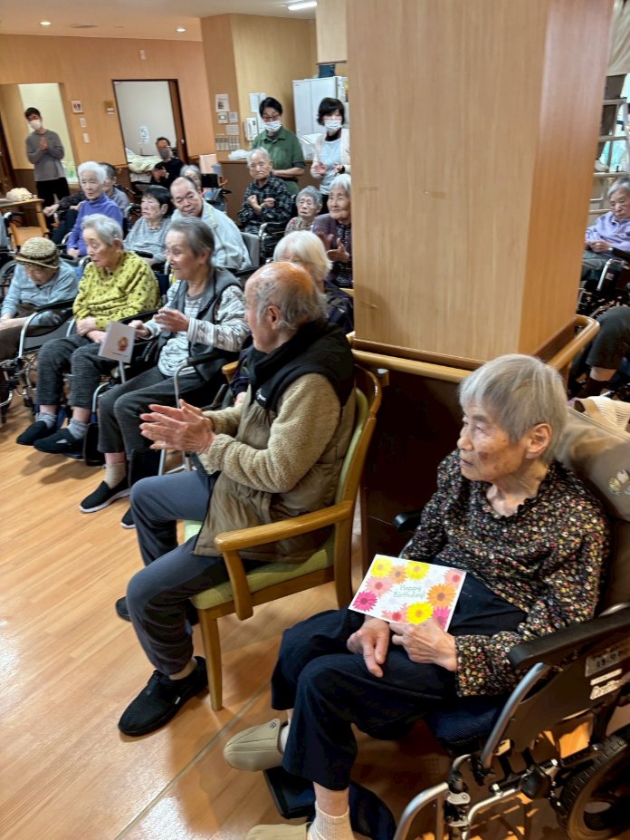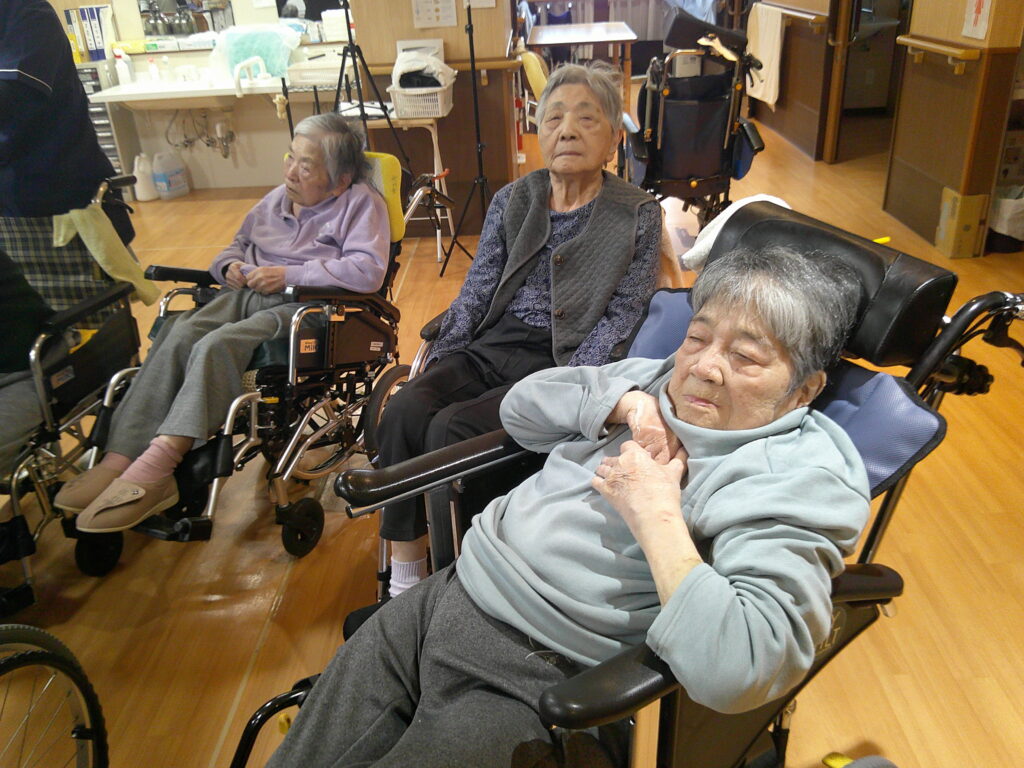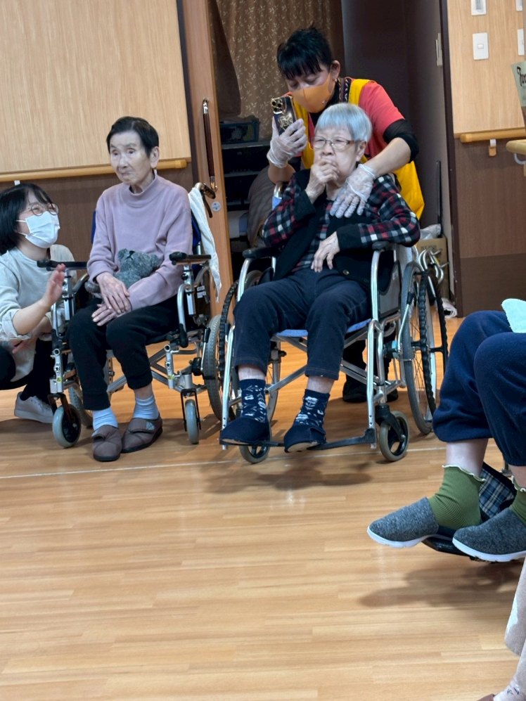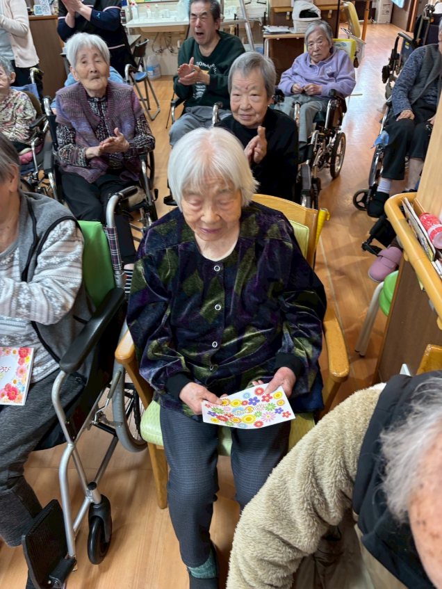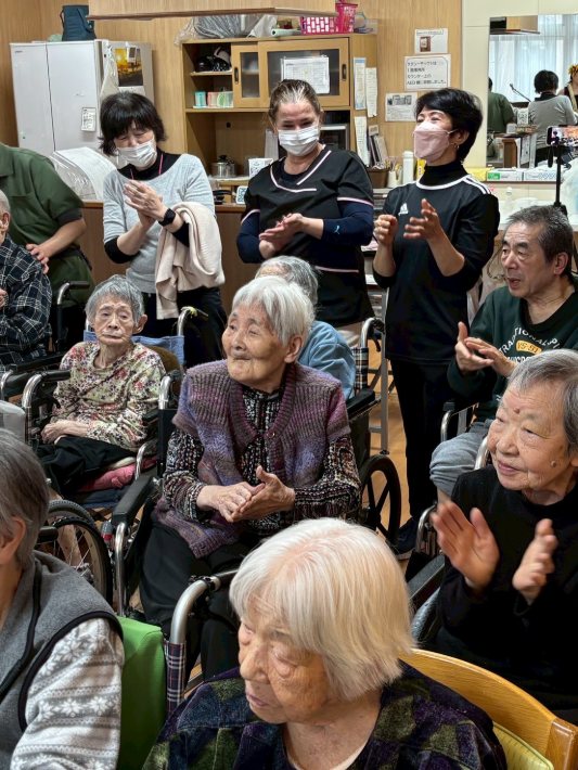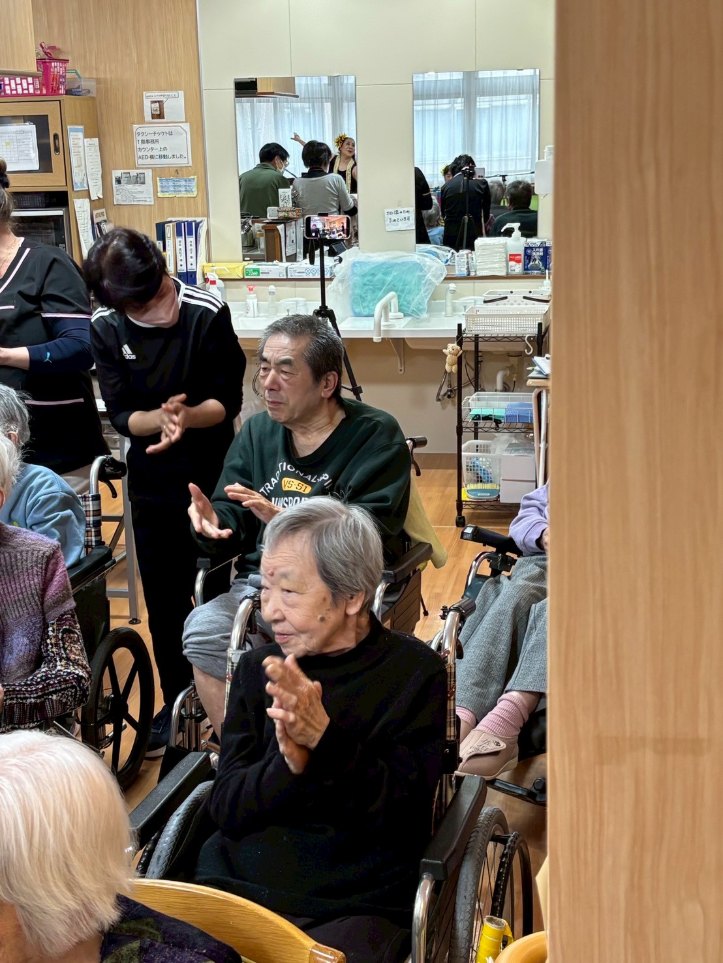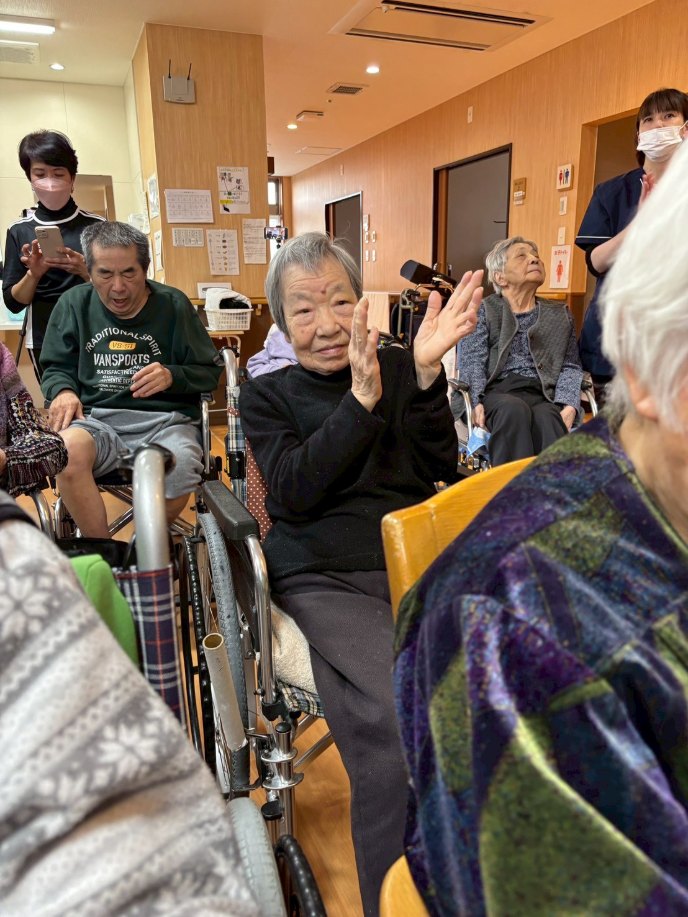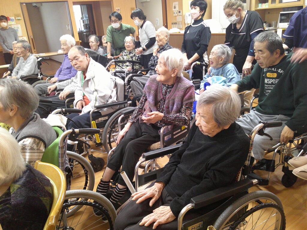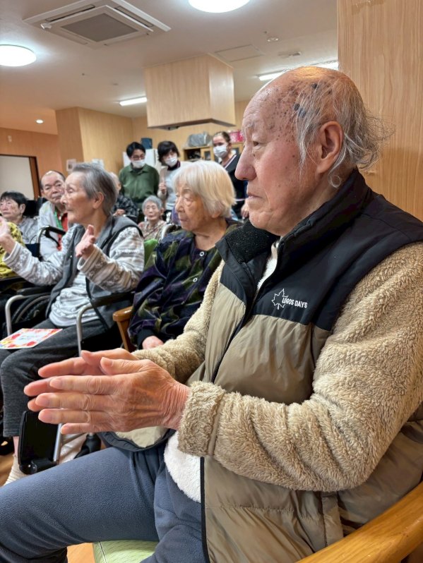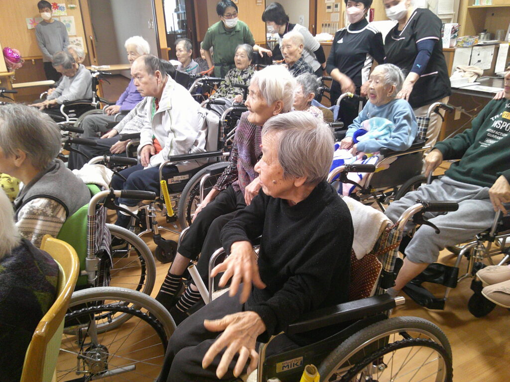 入所者様も、マラカスを振ったり、手を使ってフラの手話に一緒に参加。
